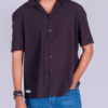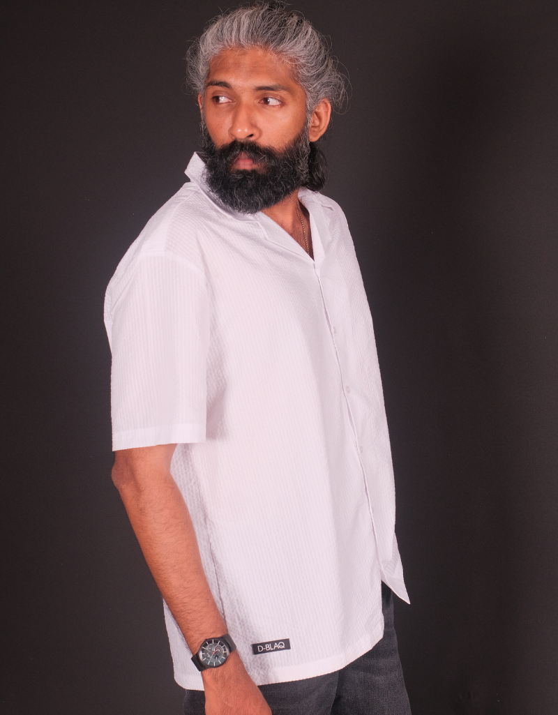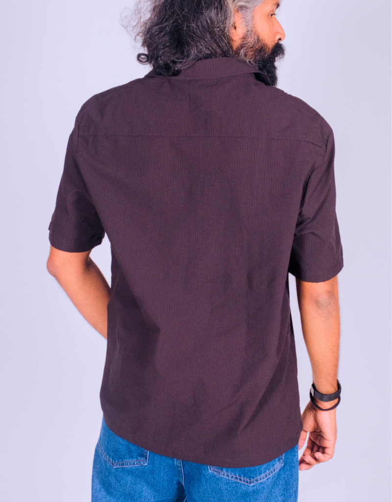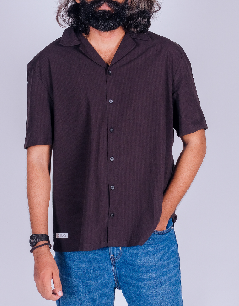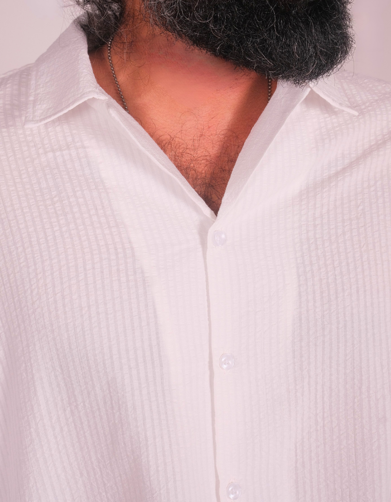 A lightweight, relaxed-fit revere-collar shirt with subtle vertical stripe texture and pop-button front — breathable cotton-blend, perfect for smart-casual looks.