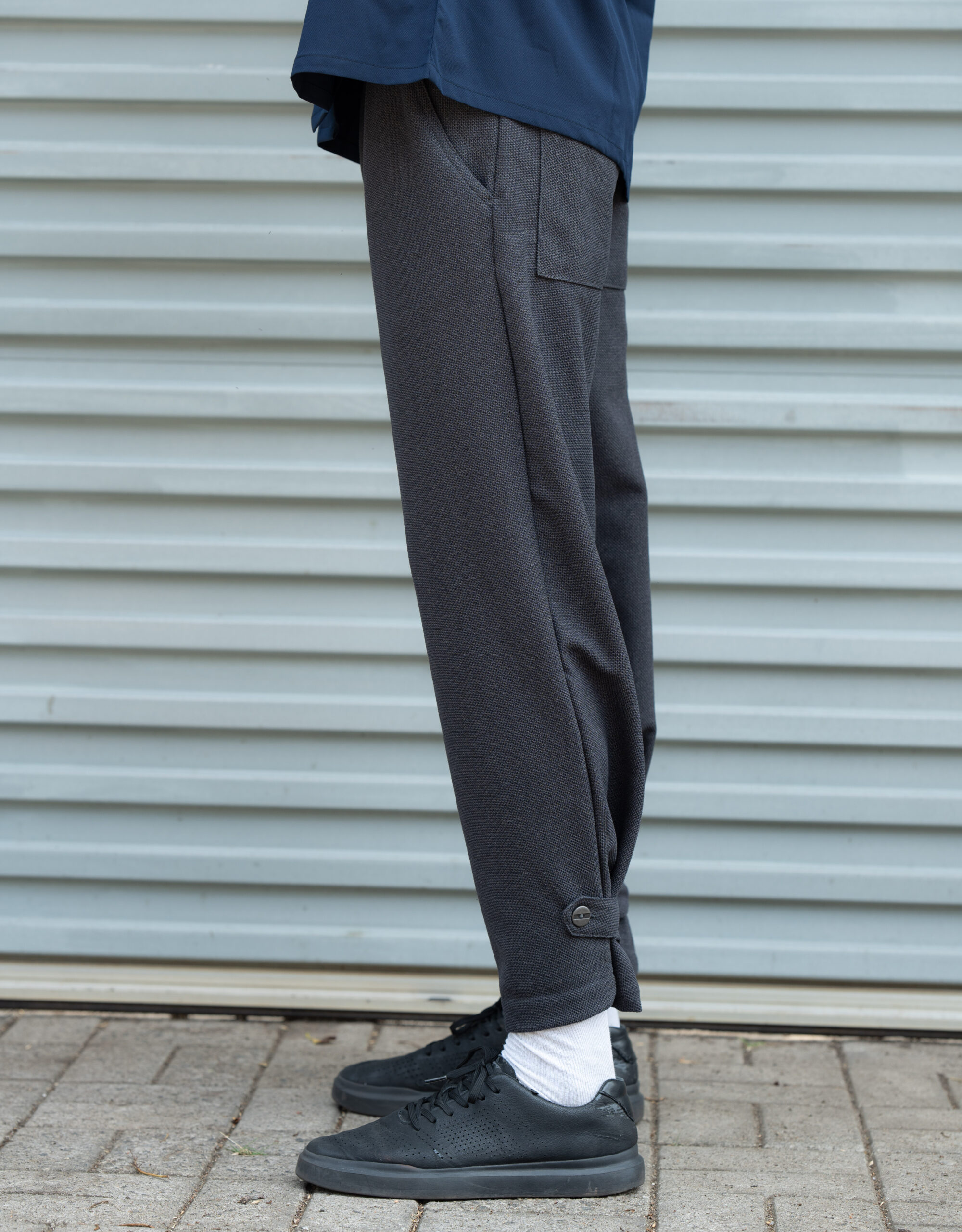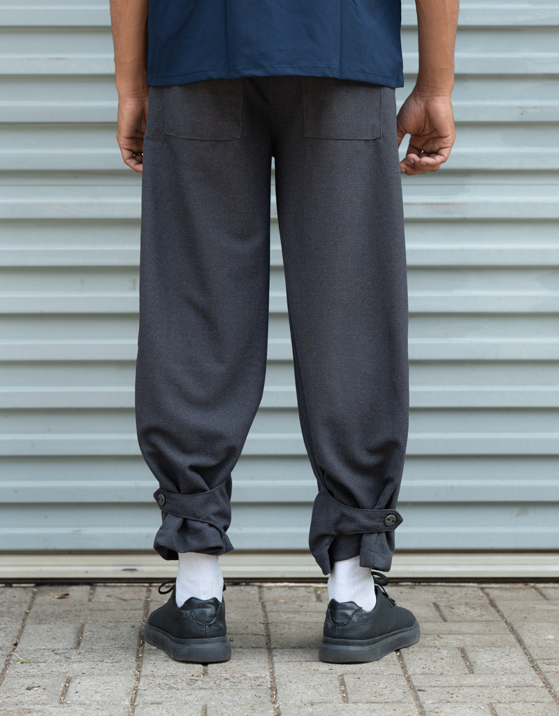 Modern street-style hakama pants designed for comfort and utility. Features multiple flap cargo pockets with button closures and a stylish ankle-button detail for a tapered look. Made with breathable, durable fabric and an elastic waistband for an easy fit. Perfect for casual wear, street fashion, or everyday comfort.